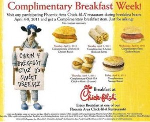 If you live in Phoenix, you can get a free breakfast every day this week from Chick-fil-A. Just visit any participating Phoenix area Chick-fil-a during breakfast hours and ask for your FREE item.No other purchase necessary.